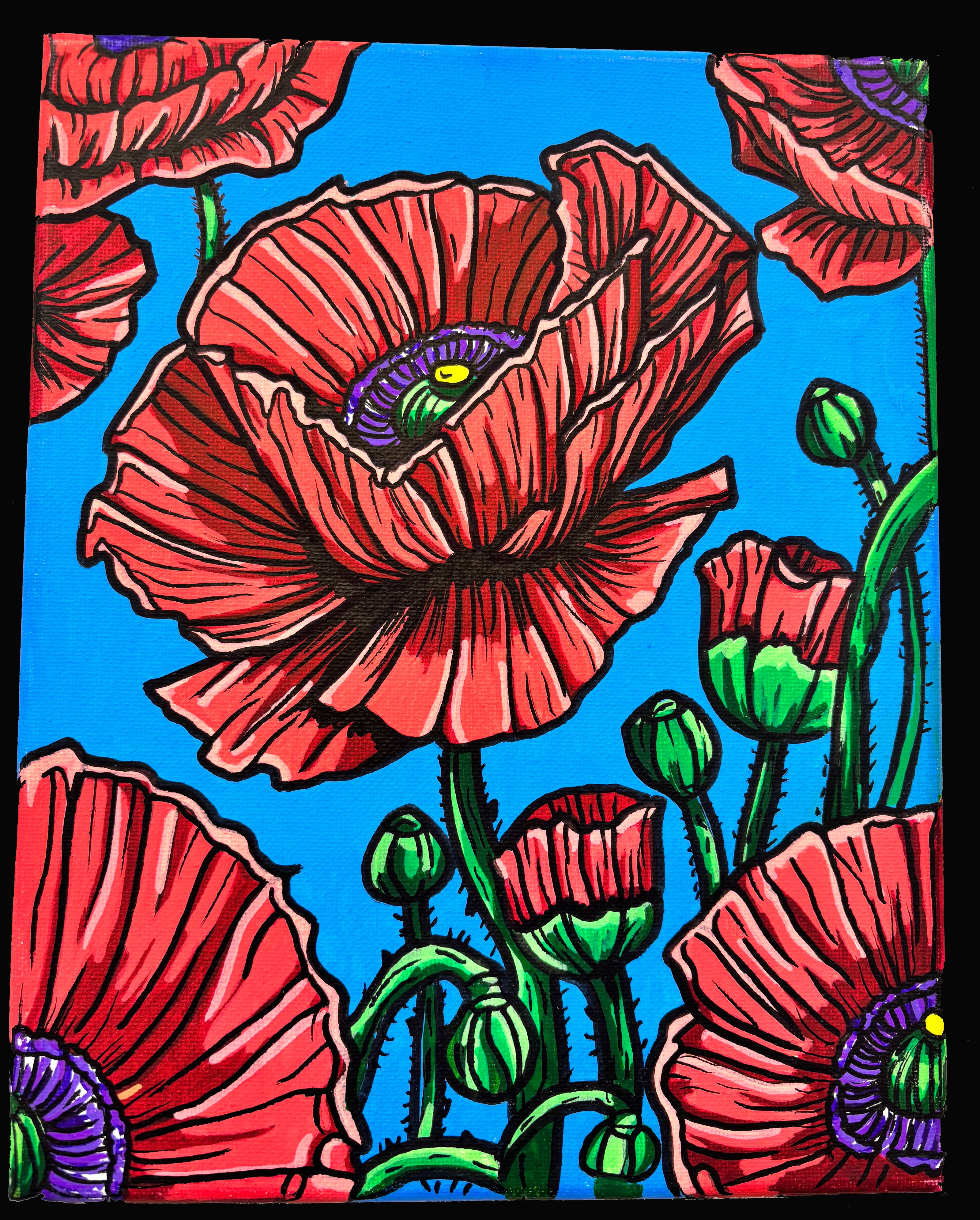 Original 8x10 abstract acrylic marker painting featuring bold red Poppies.